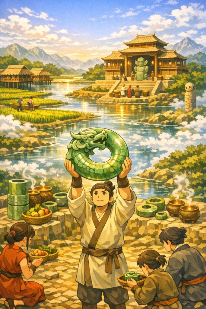 紀元前3300〜2300年頃の長江下流域は、湿地帯と湖沼が広がる稲作文明の中心地でした。北方の遼河文明とは自然環境も生活様式も大きく異なり、ここでは水と大地の循環が生命の根源として強く意識されていました。そのため、龍は北方のような「蛇の霊力を基盤としたシャーマニズム的霊獣」ではなく、水・大地・王権を統合する宗教的象徴として再構築されていきます。