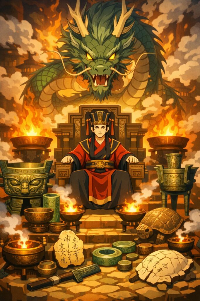 殷代の宗教は、祖先崇拝・自然神信仰・シャーマニズムが高度に体系化されたものでした。殷王は単なる政治的支配者ではなく、祖霊と天界をつなぐ巫王(シャーマン王)としての役割を担っていました。王は占卜を通じて祖霊の意志を読み取り、国家の運命を決定する存在であり、その霊的権威を象徴する存在として龍が重視されました。