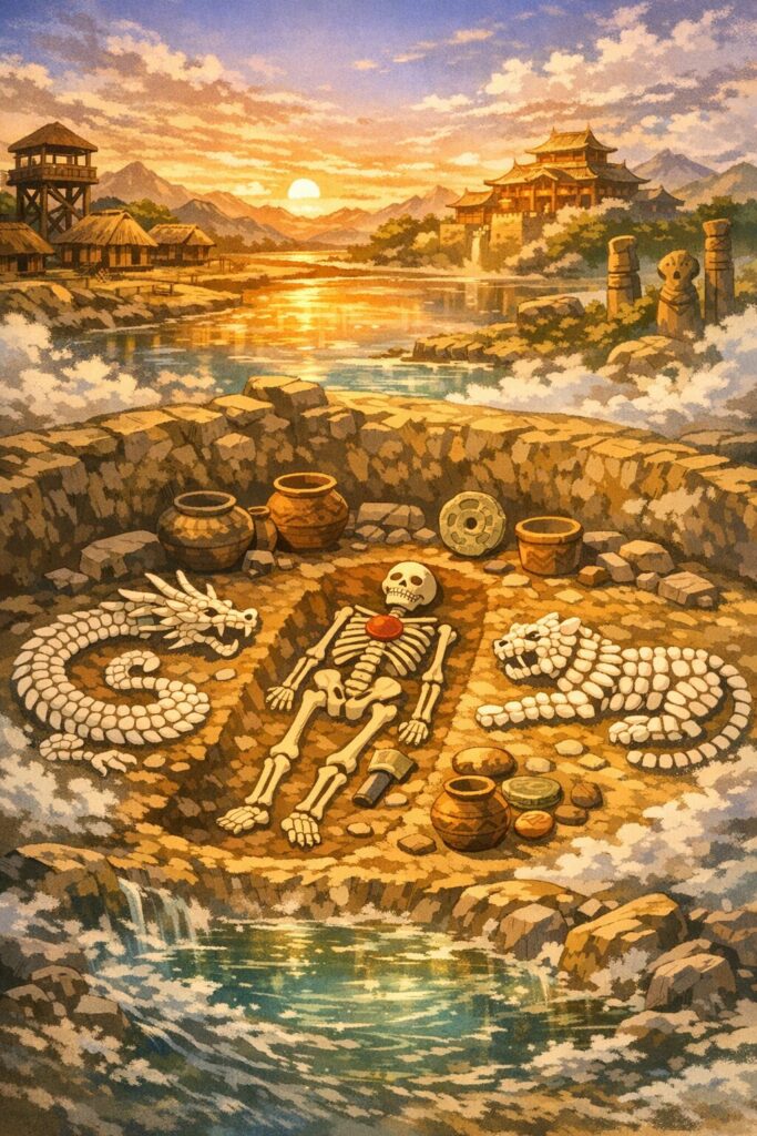 このように、東=龍、西=虎という配置は、後の四神思想そのものではないものの、すでに方位と霊獣を結びつける象徴的思考が成立していたことを示しています。南向きの埋葬は太陽の道を意識したものであり、胸部の鳥形配置は天界とのつながりを示す可能性があります。つまり、この墓全体が「小さな宇宙(ミクロコスモス)」として設計され、死者を宇宙秩序の中心に置くための儀礼的空間となっていたのです。