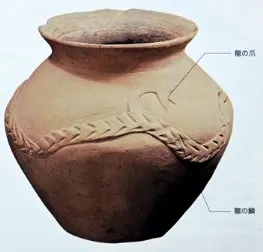 斉家文化(せいかぶんか)は黄河上流域を中心に紀元前2400年頃から紀元前1900年頃にかけて存在した新石器文化です。ここから、罐(かま)の浮き彫りによる龍に似た紋様の土器が出土しています、この浮彫の龍文は西北地域で発見された中では最古の龍の像になります。