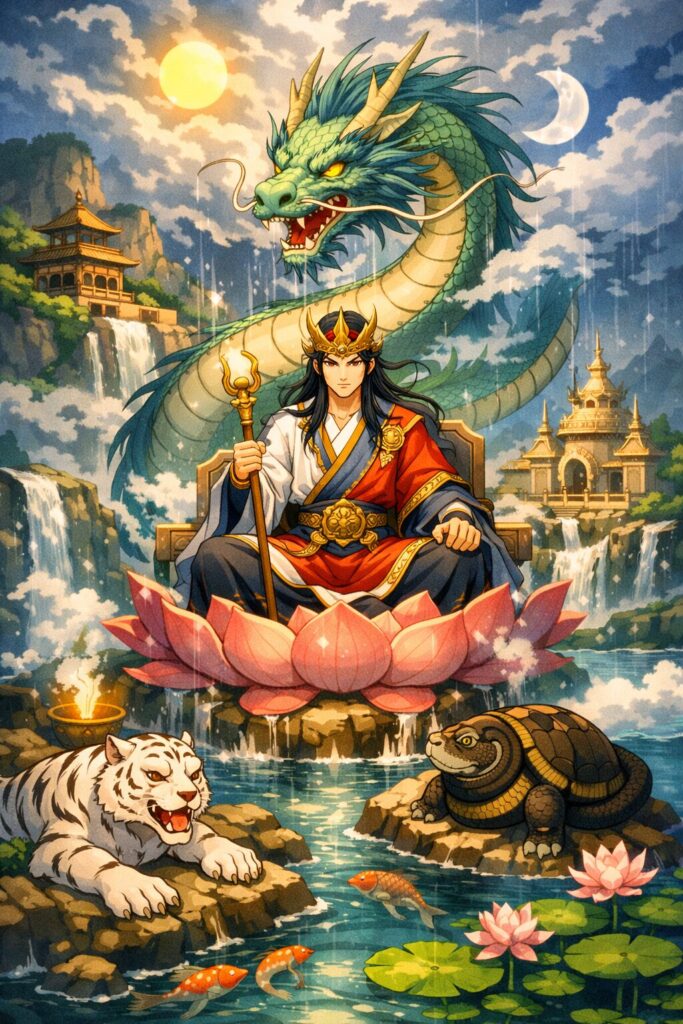 四神は、四方位・四季・五行・天文(星宿)・王権を統合する象徴体系として完成し、皇帝は中央の黄龍として宇宙の中心に位置づけられます。これは、殷代の「祖霊と王をつなぐ龍」が、より抽象化され、宇宙的・政治的象徴へと進化した姿でもあります。