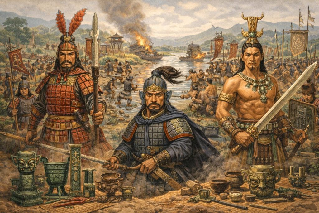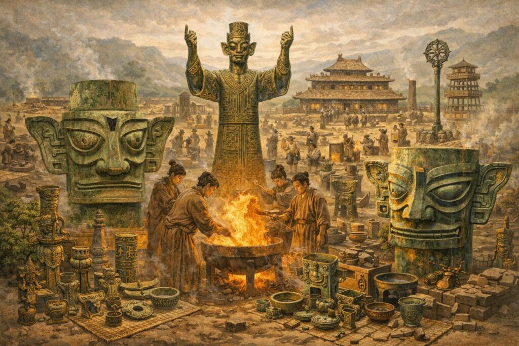 長江文明は、紀元前1500〜紀元前1000年ごろに大きな転換期を迎え、南方の楚・呉・越へとつながる文化的基盤が形づくられます。河姆渡、良渚三星堆の記憶を受け継いだ人々は、森・湿地・湖沼に適応しながら稲作、水路、木と竹の建築、祖霊祭祀を発展させ、多様な部族が交流し合う広い文化圏を形成しました。では巫による祭祀が重視され、では舟の技術や海との交易が発達し、青銅武器や祭祀具も独自の進化を遂げます。北方の周王朝との接触は緊張と交流をもたらしつつも、南方の民は独自の精神と誇りを守り続け