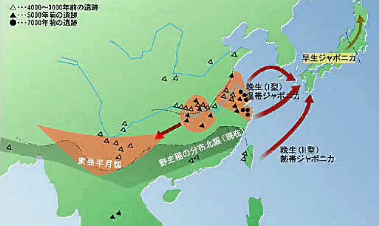最終氷河期が終焉し、地球が温暖化へ向かうと、人類の農耕がいち早く始まった地域として、東地中海の「レバント」と中国の「長江領域」が挙げられます。レバントでは大麦や小麦の栽培が始まり、中国では稲作、特に水稲が発達していきました。