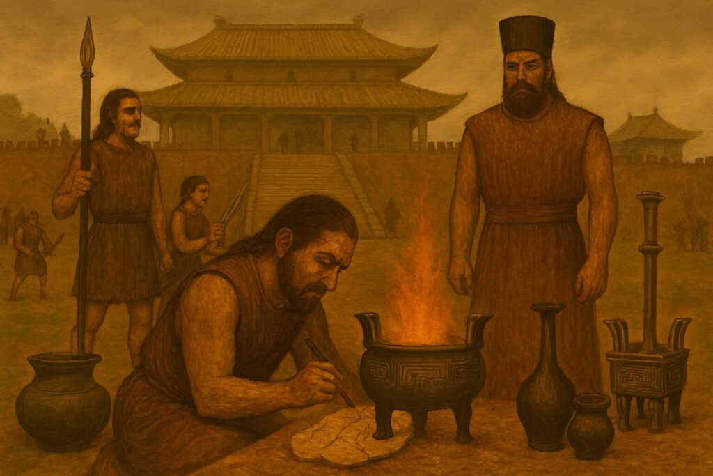 王は、亀の甲羅や牛の肩甲骨に質問を刻み、