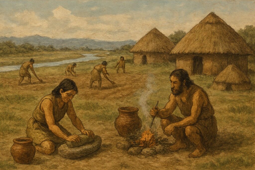 そのゆりかごの中で、名もなき人々が静かに暮らしていました。彼らはまだ王も神も知らず、ただ空と大地の声に耳を澄ませ、季節の巡りを読み取りながら、生きることそのものを世界の中心に置いていたのです。