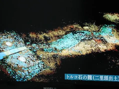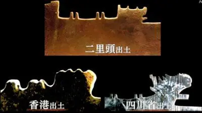 都城は陽城(現在の河南省登封市)に置かれたとされ、後の洛陽にあたる地域です。この周辺にある二里頭村で発見された 二里頭遺跡 からは、殷時代より古い宮殿跡や、当時としては世界有数の規模とされる人口2万人以上の大集落跡が見つかっています。また、遼河文明から伝わったと考えられるトルコ石で表現された龍、龍文様の玉璋(ぎょくしょう)なども出土しています。