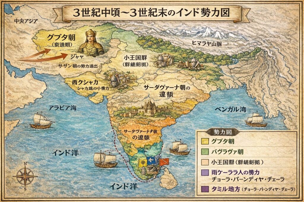 北ではクシャーナ朝が勢力を伸ばし、西ではシャカの軍勢が鋭い刃を光らせていました。