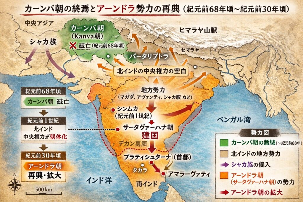 紀元前68年、マガダ国を治めてきたカーンバ朝は、長い疲労の果てに静かに崩れ落ちました。