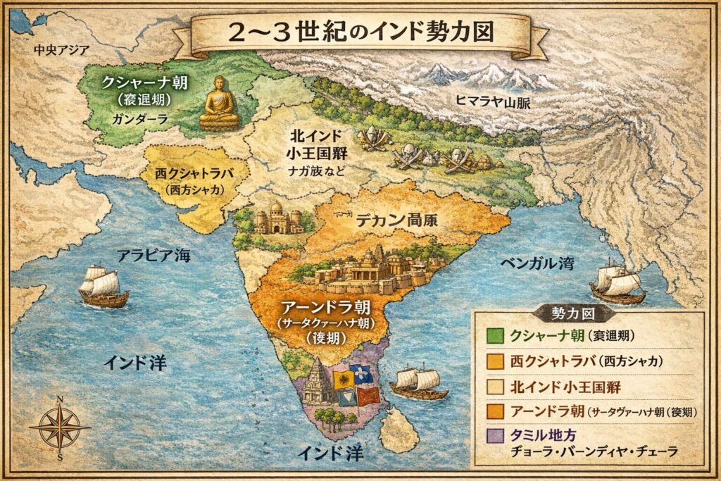 カーンバ朝が紀元前68年頃に滅亡すると、北インドの中央権力は弱まり、その空白を背景にデカンのアーンドラ朝(サータヴァーハナ朝)が再興していきます。紀元前1世紀にはシンムカが勢力を固め、1世紀後半のガウタミープトラ・サータカルニはシャカやクシャーナ朝と対抗し、デカンの覇権を確立しました。2〜3世紀にはローマとの交易が最盛期を迎え、アマラーヴァティー仏教美術が栄えます。しかし3世紀中頃から内紛と地方勢力の台頭で衰退し、3世紀末には王朝が崩壊します。その後、北インドでは4世紀初頭にグプタ朝が台頭し、サムドラグプタの遠征によって統一が進み、古典文化の黄金期へとつながっていきます。