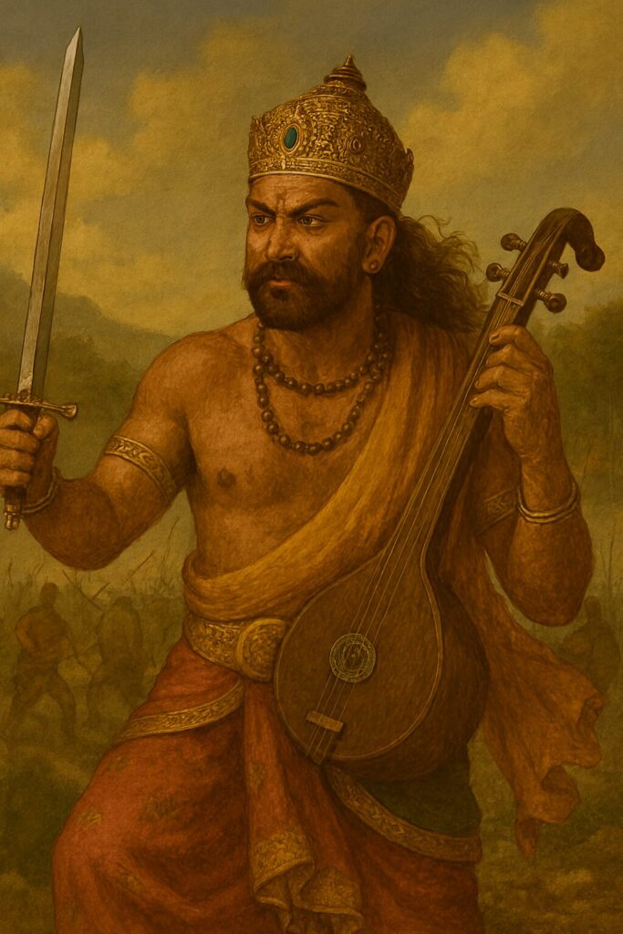 若き王 サムドラグプタ は、静かにヴィーナを奏でていました。