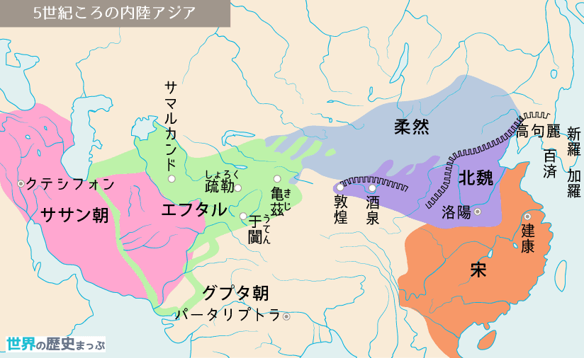 サーサーン朝ペルシア(224〜651年)は、アルダシール1世がパルティア王国を倒して建国したイラン最後の古代帝国です。ゾロアスター教を国家の中心に据え、強い中央集権と軍事力を背景に、東西世界で大きな存在感を示しました。シャープール1世の時代にはローマ皇帝ウァレリアヌスを捕虜とし、帝国の名声は大きく高まりました。6世紀のコスロー1世の治世は最盛期で、行政改革、学問の保護、ギリシア哲学の翻訳、インド知識の導入など文化が大きく発展します。しかし7世紀に入ると、東ローマ帝国との長期戦争と内乱で国力が衰え、アラブ・イスラーム勢力の台頭に抗しきれず、651年に滅亡します。滅びた後も、ペルシア文化はイスラーム世界に深く受け継がれ、後世の文学や行政制度に大きな影響を残しました。