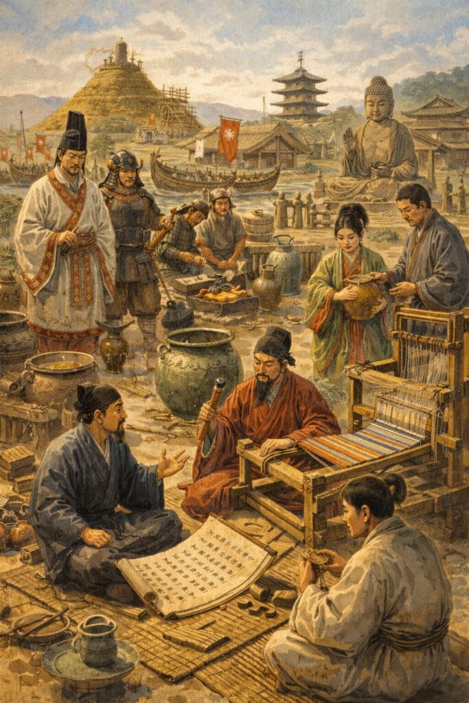 彼らは、鉄器、土木技術、文字、医術、養蚕、機織りなど、