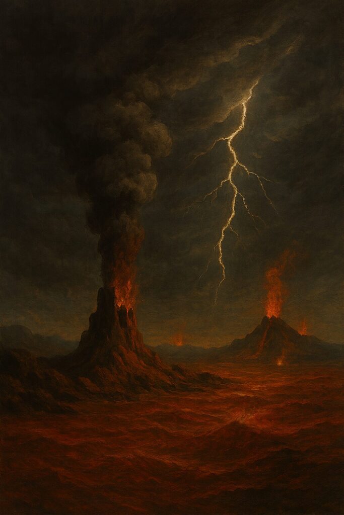 空は濃い雲に覆われ、太陽の光はほとんど地表に届かず、海は鉄分で赤く濁り、火山活動によって常に熱せられていました。