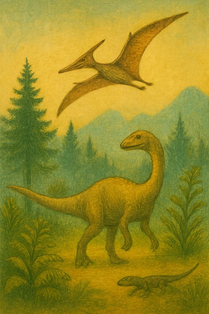 海には、魚竜や首長竜などの海棲爬虫類が泳ぎ回っていました。