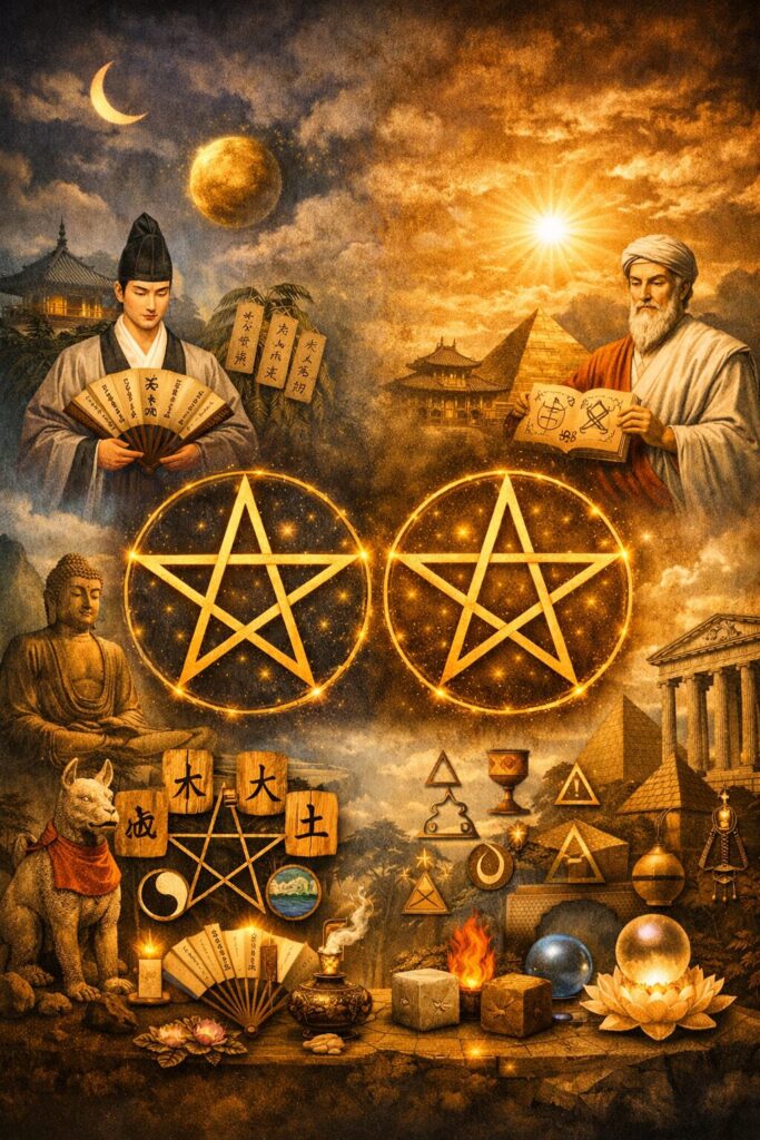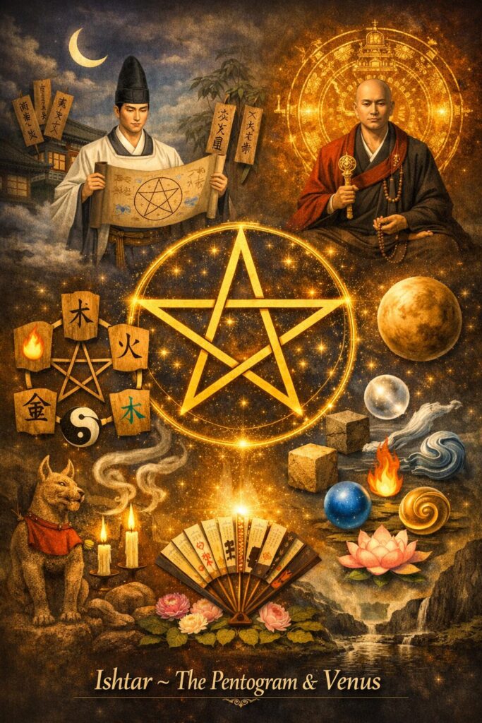 このように、五芒星は東アジア世界においても早い段階から“護符”としての役割を担い、文化の中に深く根づいていきました。後の時代に陰陽道で「晴明桔梗紋」として定着するのは、こうした古代の呪術的伝統の延長線上にあると考えられます。五芒星は、単なる図形ではなく、古代の人々が“見えない世界”と向き合うために選び取った、普遍的な記号だったのです。