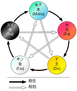 五行説では、この五つの要素「木・火・土・金・水」を五芒星の角に対応させることで、 「木は火を生み、火は土を生み、土は金を生み、金は水を生み、水は木を生む」 という良い循環を表す「相生」と、 「木は土に克ち、土は水に克ち、水は火に克ち、火は金に克ち、金は木に克つ」 という緊張関係を表す「相剋」を、視覚的にわかりやすく示すことができます。 円形で描かれるのが相生の循環、星型(五芒星)で描かれるのが相剋の関係です。