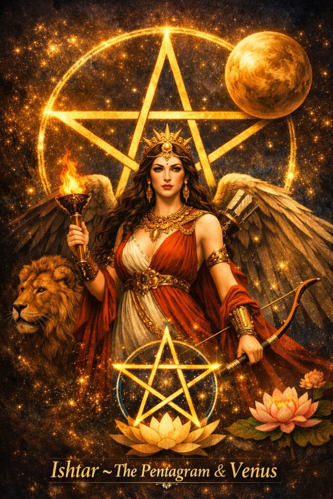この天体運動の美しい規則性は、ニンフルサグ(金星女神の原点)、イナンナ=イシュタル、アスタルテ、アフロディーテといった金星女神の象徴体系に深く影響を与えました。金星は明けの明星として鋭い光を放ち、宵の明星として柔らかな光を湛えます。その二面性は、愛と戦い、豊穣と破壊、死と再生といった女神の多面的な性格と重ねられ、五芒星の形は“金星の力が世界に刻むリズム”として神聖視されました。五という数が花弁、星、生命の循環と結びつき、金星女神の象徴が“星・花・五”へと収斂していった背景には、この天文学的な事実が横たわっています。