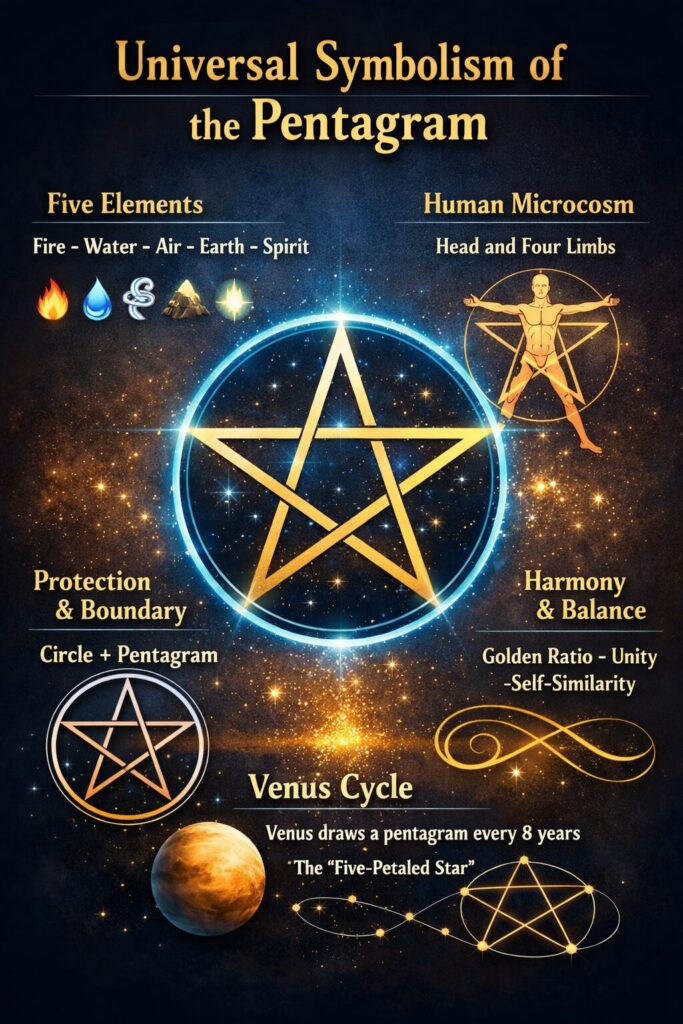 五芒星は、東西を問わず「自然・人間・宇宙」を結ぶ象徴として用いられてきました。正五角形の内部対角線から生まれるこの図形は、黄金比と自己相似を内包し、調和と永続性を示します。