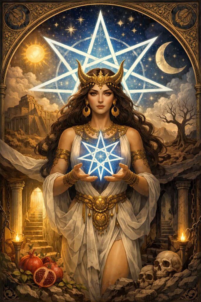 イナンナはメソポタミア神話の中で唯一、「天界・地上界・冥界」という三層世界を自由に往来する女神です。特に『イナンナの冥界降下』では、七つの門を通過しながら力を剥がされ、死に、復活し、再び上昇するという劇的な構造を持ちます。この“七つの門”は、七芒星の七頂点と象徴的に重なり、七芒星が持つ「階層を通過する星」「異界への通路」という性質と完全に一致します。