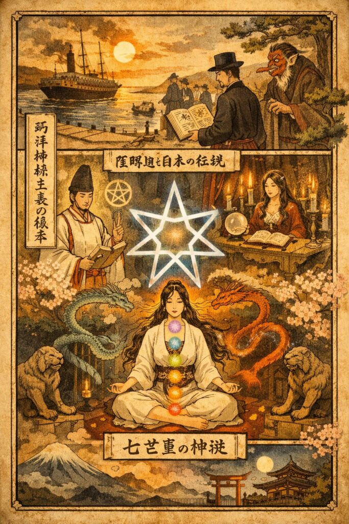 七芒星が東洋に姿を見せるのは、明治以降、西洋の魔術・オカルティズム・神智学が大量に流入してからです。近代日本は、西洋の神秘思想を翻訳・紹介する過程で、五芒星・六芒星に続いて七芒星を“新しい魔術記号”として受け取りました。しかし、この受容はあくまで外来の知識であり、東洋の伝統的宇宙観と自然に結びついたものではありません。