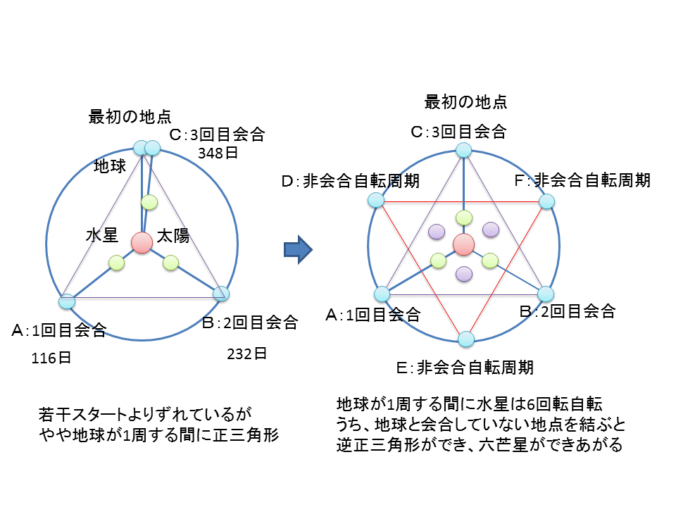 地球と金星の会合周期(地球ー金星ー太陽が一直線に並ぶ)の描く頂点を結ぶと、きれいな五芒星が描かれていましたが、地球ー水星ー太陽の会合周期の描く頂点を結ぶと、六芒星が現れるようです。