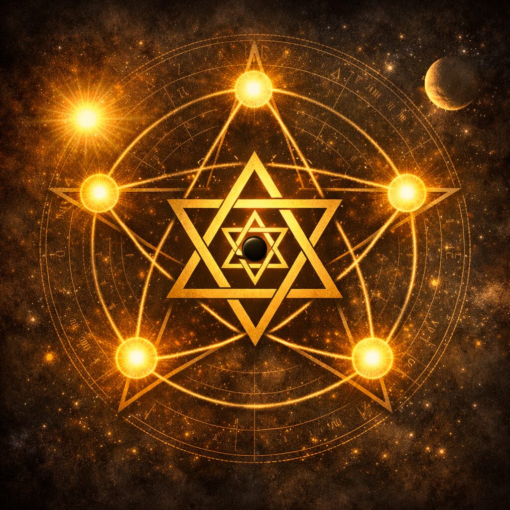 このため六芒星は、「金星女神の二面性が統合された姿を幾何学化した図形」と解釈できます。金星の天文学的運動が示す反転性や二重性、神話における上下往還の構造、そして女神が持つ愛と戦いの両面性が、六芒星という形の中に凝縮されているのです。こうした視点から六芒星を見ると、単なる記号ではなく、宇宙と神話をつなぐ深い象徴としての姿がより鮮明になります。