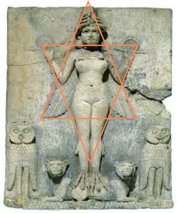 紀元前3000年前のシュメール/メソポタミア文明の遺跡のレリーフの中に六芒星そのものではないものの、イナンナ/イシュタルと六芒星的な構造を帯びた図像が複数存在します。(「ウルクのイナンナ像」イシュタルの戦闘レリーフ」「イシュタル門の星紋」など)