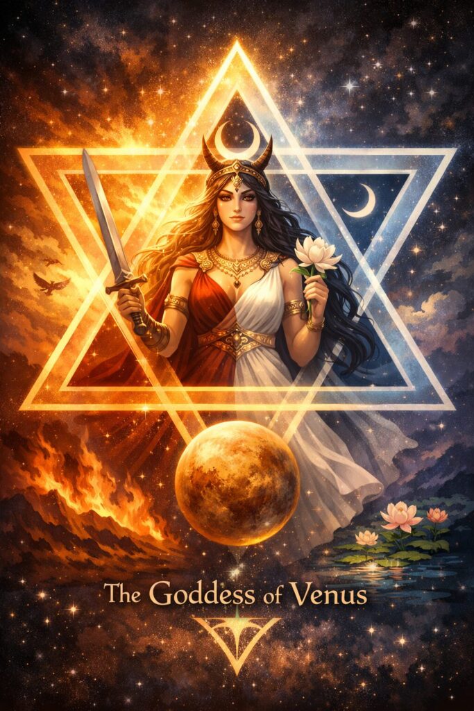 六芒星は、この二つの原理が対立ではなく調和として結び合う姿を示す図形です。天と地、火と水、男性原理と女性原理、精神と物質、破壊と創造、明けの明星と宵の明星――これらはすべて金星女神が世界中で帯びてきた象徴と一致します。イナンナ/イシュタル、アスタルテ、アフロディーテ、ラクシュミー、日本の弁才天や瀬織津姫に至るまで、金星の女神は常に「二面性を統合する存在」として描かれてきました。