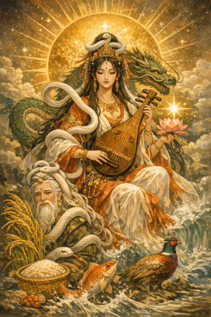 日本では、金星女神に直接対応する存在は明確ではありませんが、象徴構造の観点から弁才天や瀬織津姫が近い位置にあります。弁才天は水の女神でありながら、音楽・言語・智慧の象徴でもあり、精神的な光を放つ存在です。瀬織津姫は浄化と再生の力を持つ水の神であり、天地をつなぐ流動の象徴です。これらの女神は「水(▼)と光(▲)」の結合という六芒星的構造に近く、陰陽の調和を体現しています。日本的な文脈では、六芒星は「籠目文様」として魔除けや結界の象徴となり、霊的な調和を守る印として機能してきました。