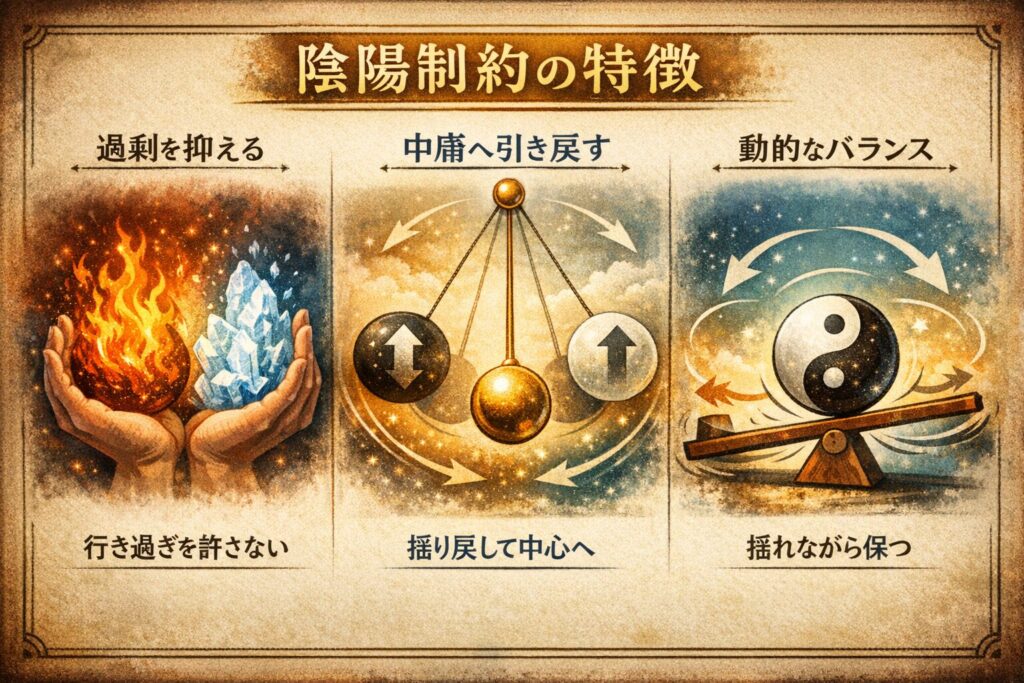 陰陽制約=陰陽が互いを抑制し、偏りを中庸へ戻す力学。