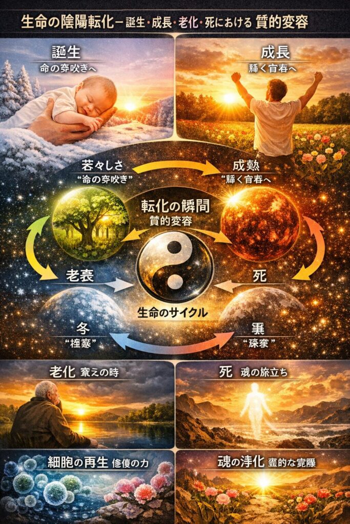 成長期には陽が増大し、 やがてその陽が極まると、 思春期の不安定という“陰の揺らぎ”が生まれます。 成熟は陽の安定であり、 老化は陰の増大であるものの、 その陰が極まると、 死という陽的な解放へと転化します。