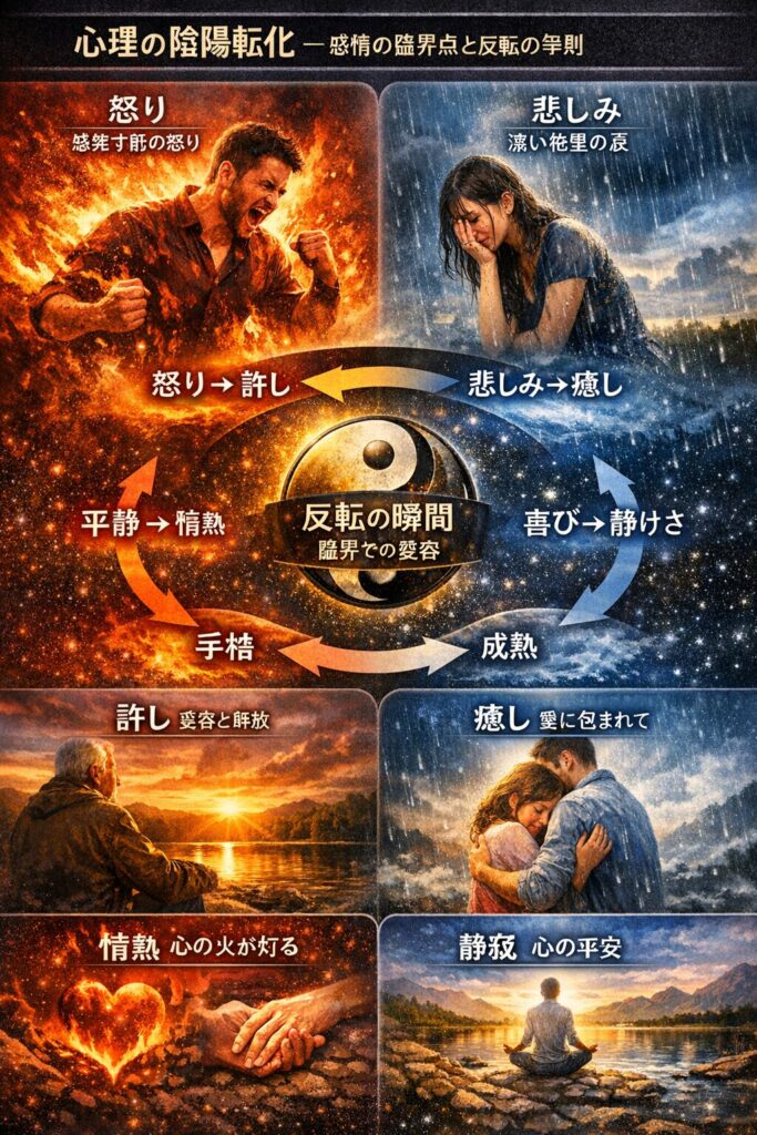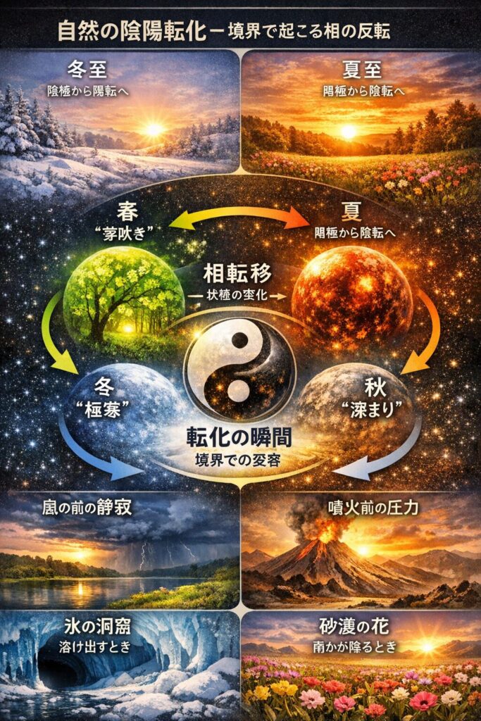 陰が極まるとき、そこにはすでに陽の萌芽が潜み、 陽が極まるとき、そこには陰の影が静かに息づいています。 転化とは、この潜在が顕在へと跳躍する瞬間であり、 宇宙・自然・生命・心・社会・神話のすべてに共通する 深層構造のダイナミズムです。