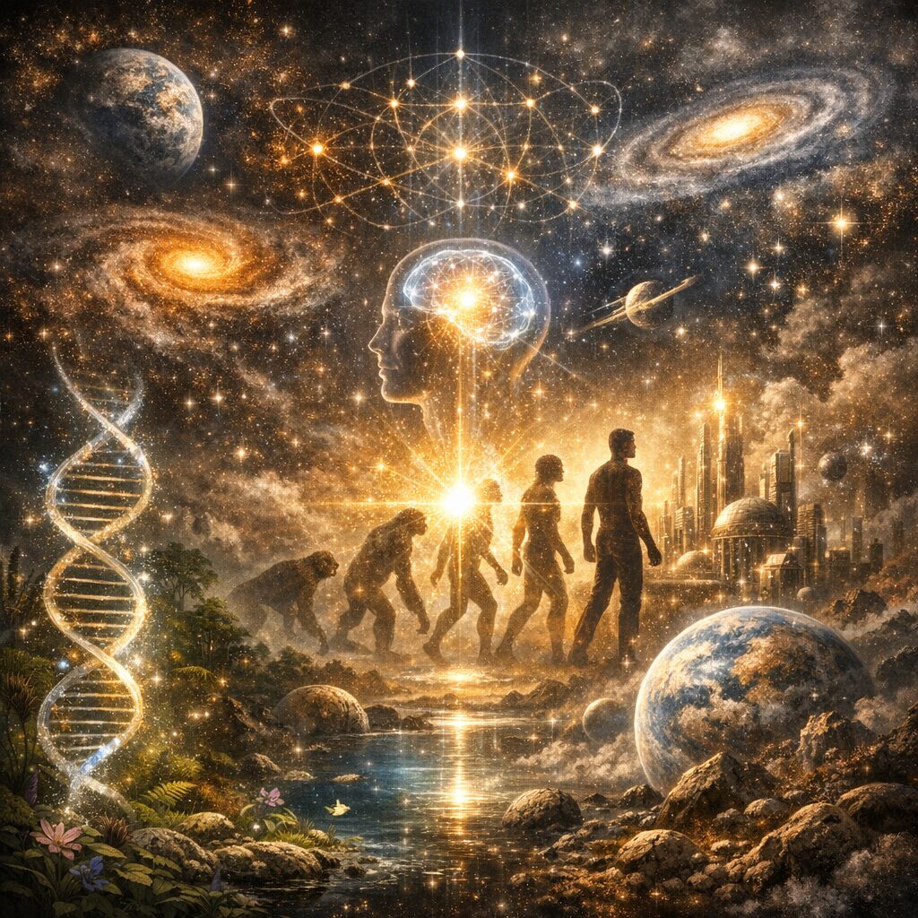 意識の誕生は、生命の転化です。 単なる生存活動を超え、世界を認識し、記憶し、意味づける能力が生まれたとき、生命は意識へと飛躍しました。意識は生命の内部から生まれた“別次元の宇宙”であり、ここでも転化が働いています。