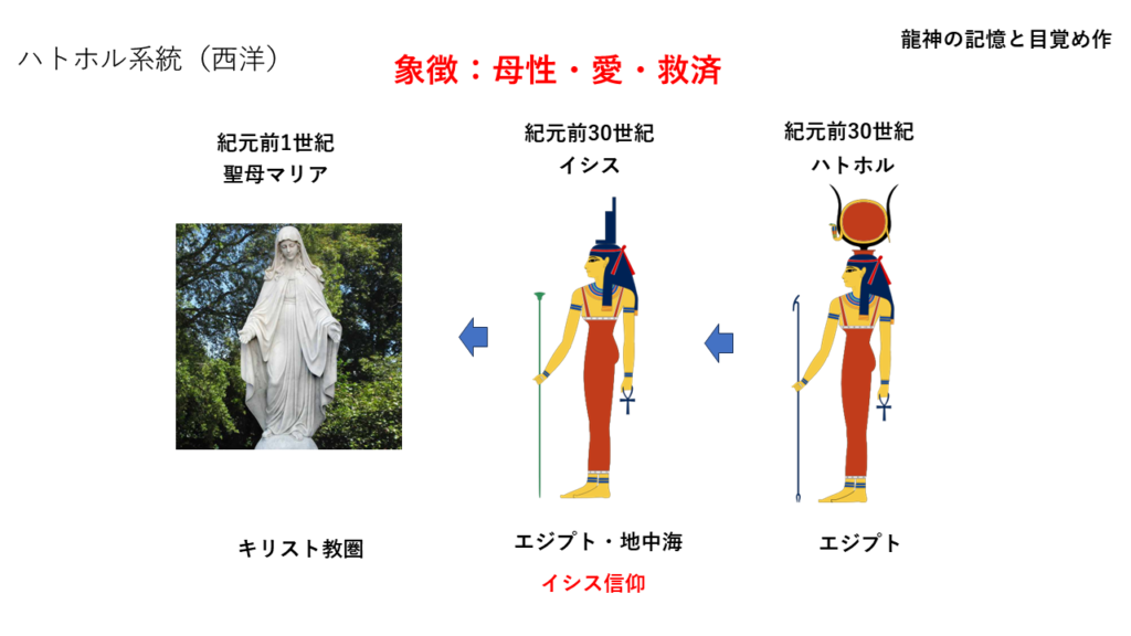 ハトホル(エジプト)→イシス(エジプト・地中海)→聖母マリア(キリスト教圏)
