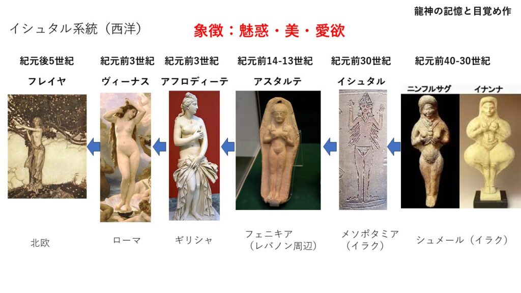 ニンフルサグ(シュメール)→イナンナ(シュメール) → イシュタル (メソポタミア)→ アスタルテ(フェニキア) → アフロディーテ(ギリシャ) → ヴィーナス (ローマ)→フレイヤ(北欧神話)