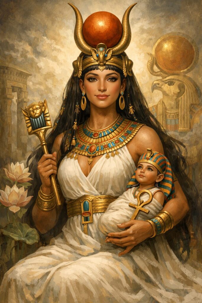 古代エジプトの女神ハトホルは、愛・美・音楽・母性を司る「天の母」として崇拝され、金星の象徴を帯びた大女神でした。その母性的な力は、のちにイシスへと受け継がれます。イシスは夫オシリスを蘇らせ、幼いホルスを守り育てた女神として、魔術と再生、そして深い母性の象徴となり、地中海世界全体に広まりました。特に「ホルスを抱くイシス像」は、母と子の救済の象徴として人々に愛されました。