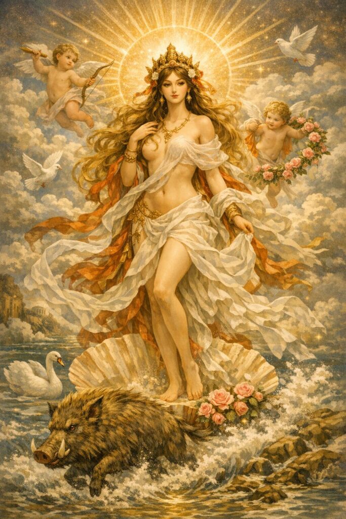 アフロディーテの信仰はギリシアからローマへと広がり、ローマではヴィーナスとして国家的な守護神の役割を担うようになります。ヴィーナスはローマ建国神話にも深く関わり、ローマ人は自らを「ヴィーナスの子孫」と考えるほどでした。このように、アフロディーテは古代世界において愛と美の象徴であると同時に、王権や国家の正統性にも関わる重要な女神でした。