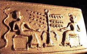 エンキ(左)とニンフルサグ(右)が人類創世について話し合っているレリーフ。