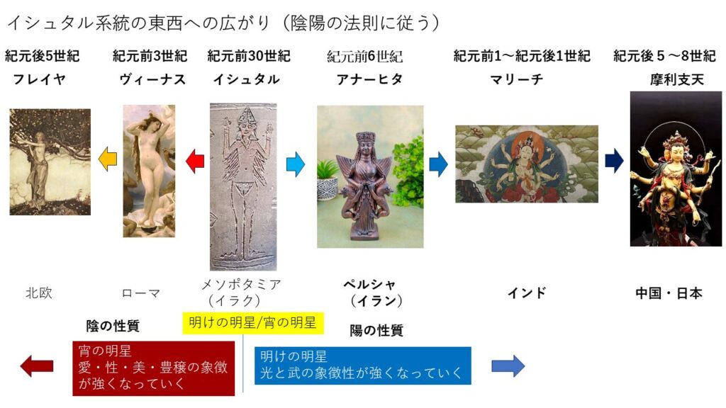 このように、イシュタルのもつ金星の象徴は単なる文化的分岐ではなく、宇宙的な陰陽の調和の中で拡散し、西洋では「陰:宵の明星・愛と美の女神」として柔らかい光を、東洋では「陽:明けの明星・光と武威の守護神」として鋭い光として発展し、二つの光の原理として世界に広がっていったといえます。