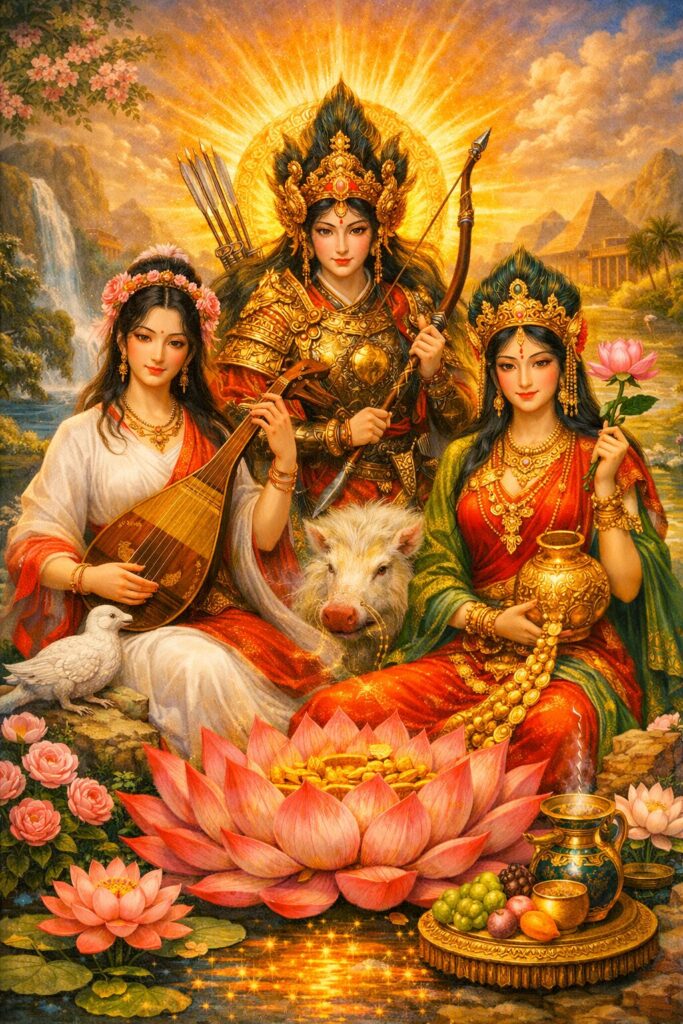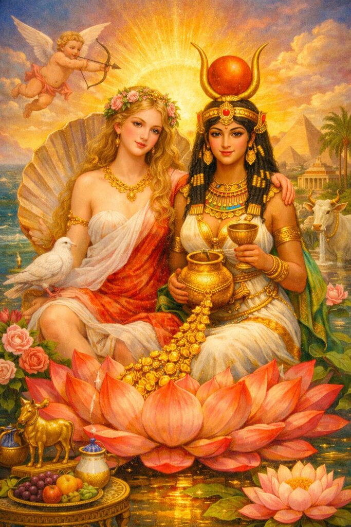 もうひとつの流れは、インドのラクシュミーを中心とする系統で、こちらは 宵の明星(Evening Star) の柔らかな光に対応します。ラクシュミーは美・繁栄・幸福・吉祥を象徴する女神として成立し、その性質は仏教に取り込まれて吉祥天となり、日本では天平文化の中で優雅で穏やかな福徳の女神として受容されました。この系統は、戦いではなく調和、鋭光ではなく柔光、支配ではなく幸福と豊穣を象徴し、金星の“静の側面”を最も純粋に伝えています。