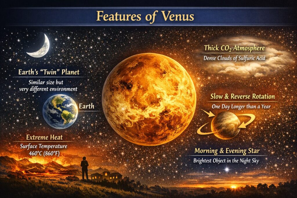 金星は、太陽系の惑星の中でもとりわけ特異な性質を持つ天体です。地球のすぐ内側を公転しており、その大きさや質量が地球と非常によく似ていることから「地球の双子星」と呼ばれることがあります。しかし、その環境は地球とはまったく異なり、厚い二酸化炭素の大気と硫酸の雲に覆われ、表面温度は約460度にも達します。これは太陽に近いからではなく、強烈な温室効果によって熱が逃げないためです。