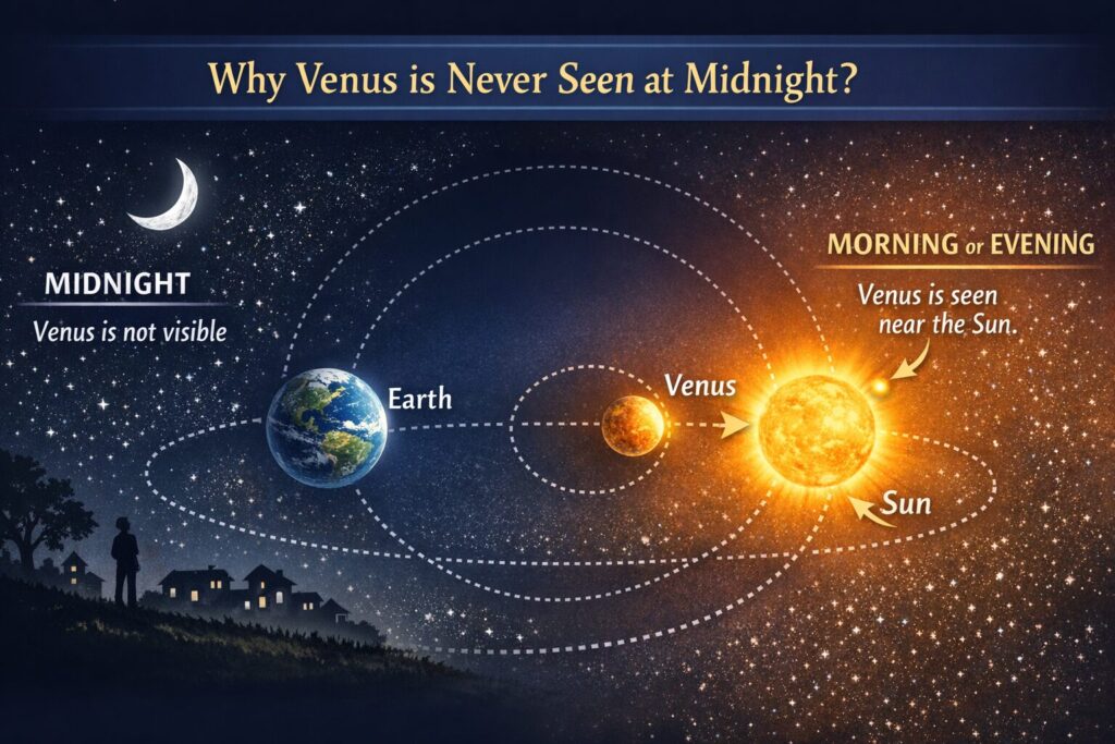 この性質は偶然ではなく、金星の軌道そのものが生み出す必然です。金星は太陽のすぐそばを巡るため、地球から見れば「太陽の伴侶」のように寄り添って動きます。明け方には太陽に先立って昇り、夕暮れには太陽の後を追うように沈んでいきますが、太陽が地平線の下に深く沈み込む真夜中には、金星もまた太陽の方向に隠れてしまうのです。