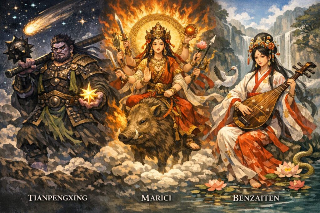 仏教において金星と深く結びつくのが摩利支天です。サンスクリット語の「Marīci」は「光の女神」を意味し、金星の輝きを象徴します。摩利支天は戦場で敵に見えない力を授ける守護神として信仰され、金星の「光と隠れ」の二面性を体現しています。日本では武士の守護神としても崇められ、京都の建仁寺や東京の摩利支天尊堂などで祀られています。
