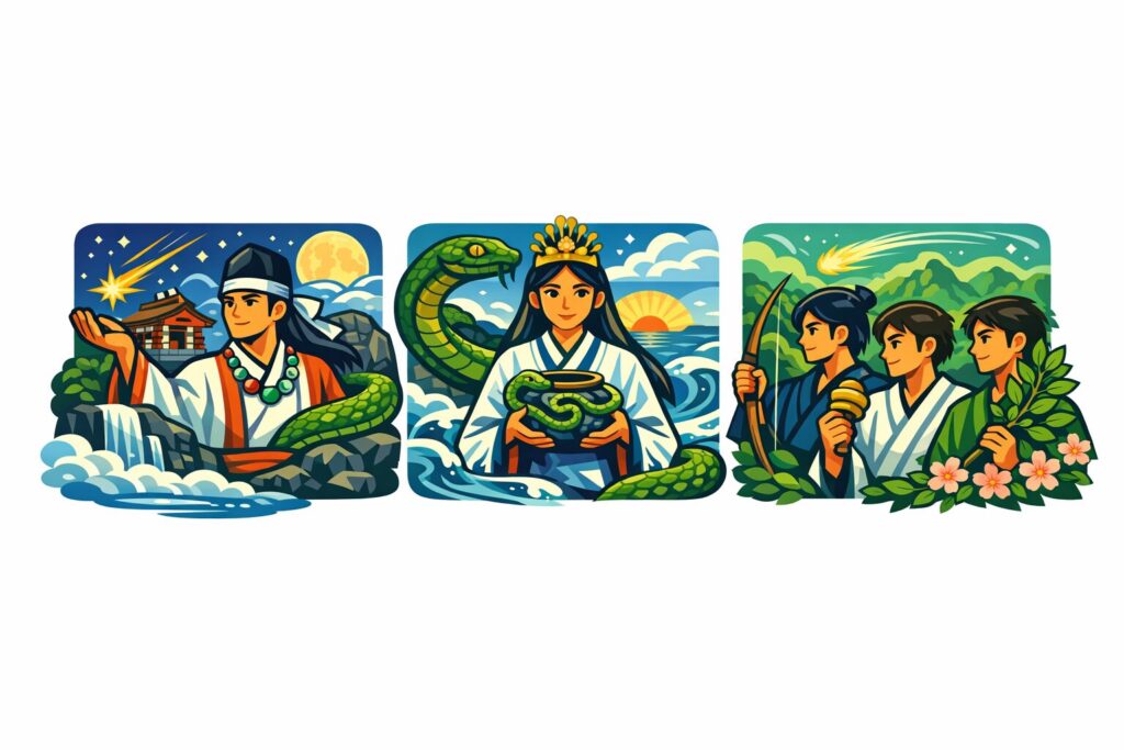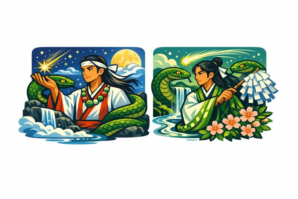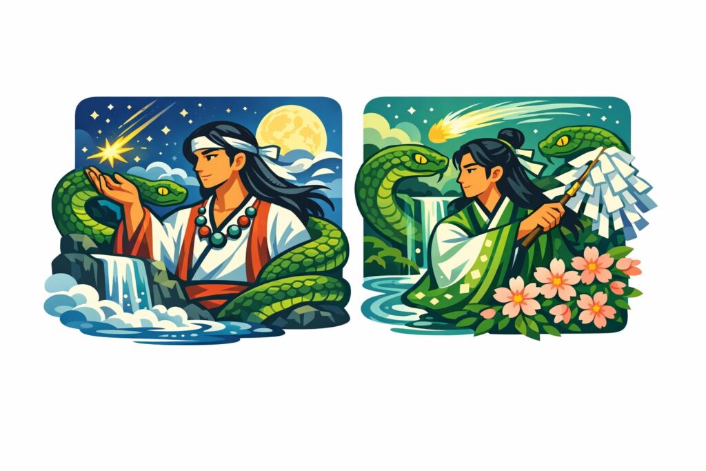 さらに象徴論的には、速玉之男はイザナギの吐いた唾から生まれますが、唾は古代において霊力と契約を象徴し、天から落ちる光の粒=流星と結びつけられることがあります。流星は尾を引く光として“天の蛇”の象徴とされ、蛇神の天的相を示します。一方、事解男神は掃き払う動作から生まれますが、掃き星=彗星は古代では“天が掃き清める光”と理解され、これも尾を引く蛇的な光として捉えられました。二柱が流星・彗星という天上の蛇的象徴と結びつくのは、彼らが“天と地を貫く浄化の力”を帯びているためです。