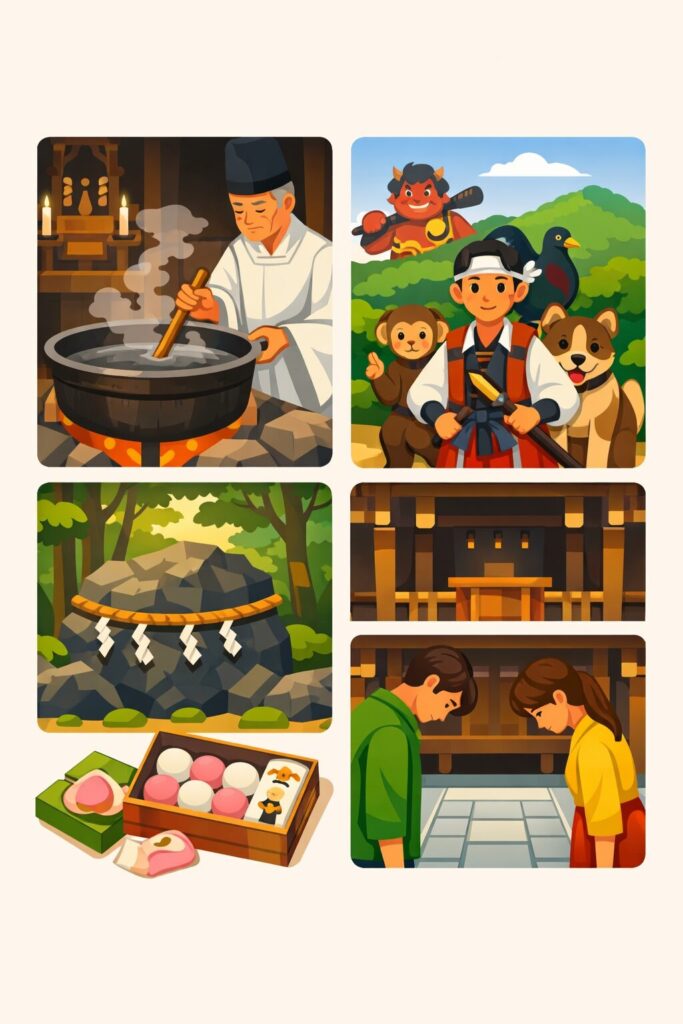 吉備津彦命が温羅(うら)という異形の存在を討伐した伝説。 温羅は鬼として語られますが、実際には吉備の山に宿る古い地霊=蛇神の象徴です。 吉備津彦命は太陽神的な英雄であり、太陽と蛇(地霊)の対峙と調和を表す物語。 戦いの後、温羅の霊は御竈殿に鎮められ、鳴釜神事として今も声を発すると伝えられます。 つまり、征伐ではなく「和合」の神話であり、国家神話と地霊信仰が共存する稀有な構造です。