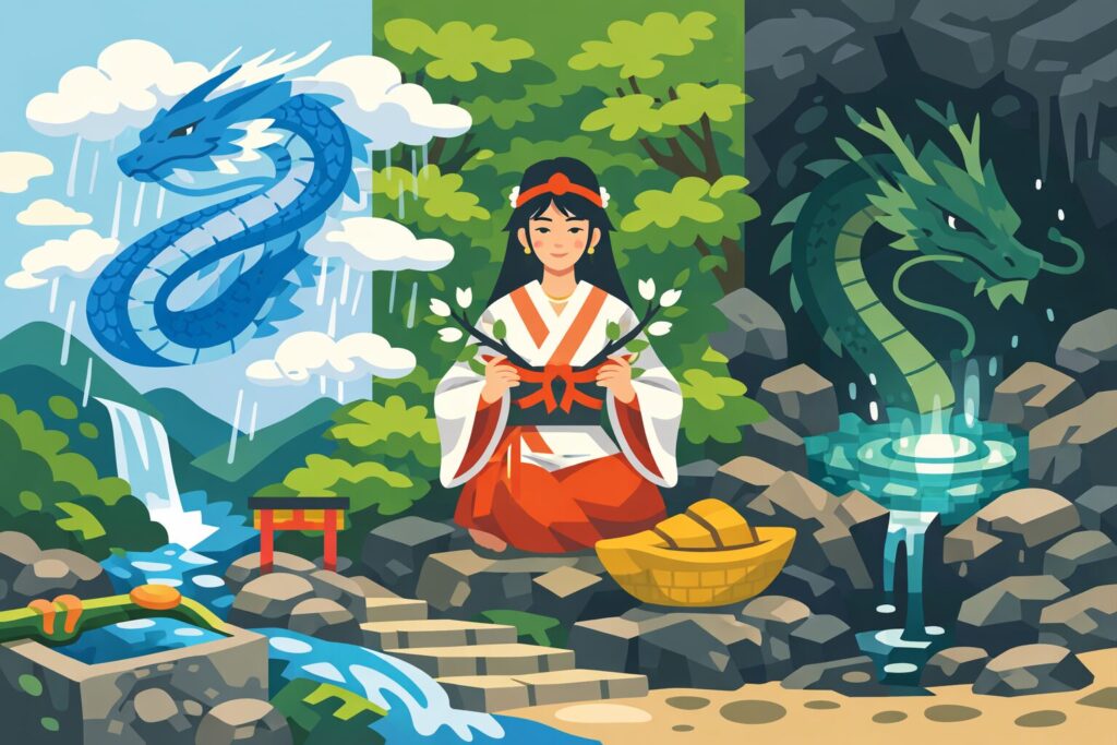 高龗神は『古事記』『日本書紀』では、火の神を斬った際に流れた血から生まれたとされます。火の破壊力の中から水の神が生まれるという逆説的な神話は、自然界の循環を象徴するものでもあり、破壊と再生、乾きと潤いという対立が一つの流れの中で転化していく日本的宇宙観をよく表しています。貴船神社が「祈雨・祈晴」の中心として扱われたのは、この神が単なる水の精霊ではなく、天候そのものを動かす“気象の主”として認識されていたからです。