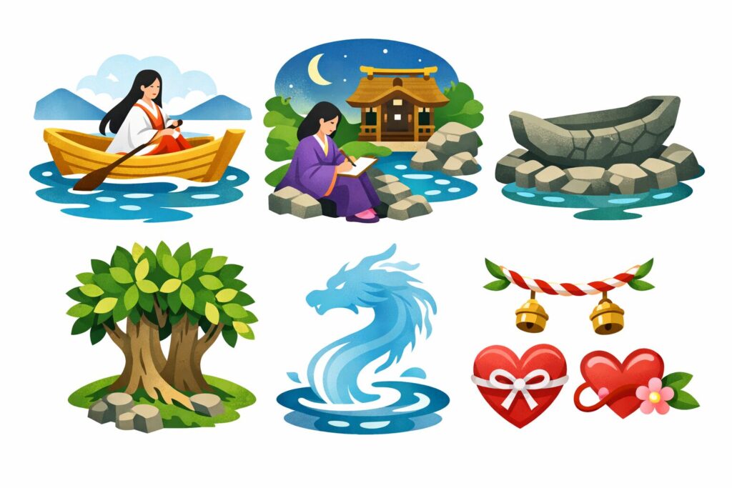 この物語は、神が“水の流れに導かれて降臨した”というより、むしろ“水そのものが神を迎え入れた”かのような印象を与えます。奥宮に残る「御船型石」は、その船を小石で覆い隠したものとされ、古代の人々がこの伝承をどれほど大切にしていたかを静かに物語っています。山の奥深く、光が細くなる場所にひっそりと残るその石は、今もなお創建の記憶を宿したまま、訪れる者に静かな気配を放ち続けています。