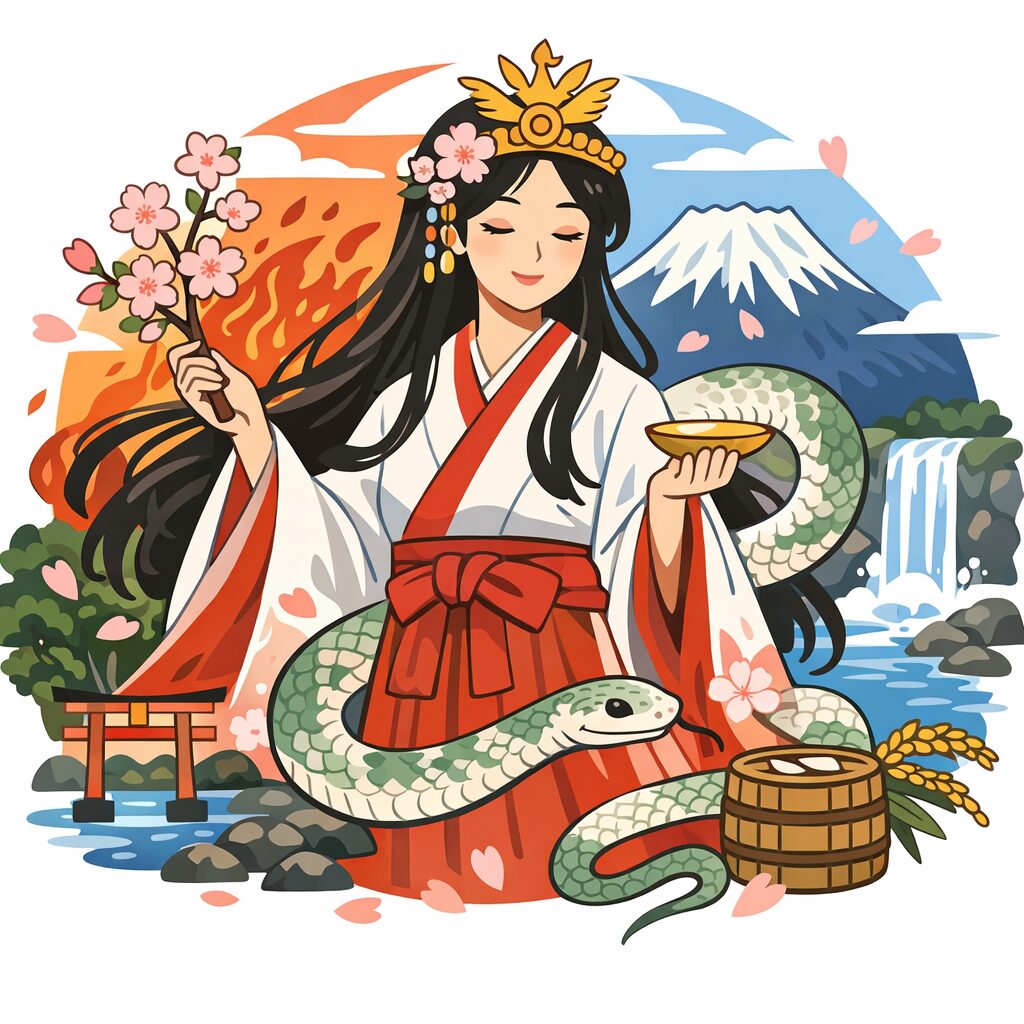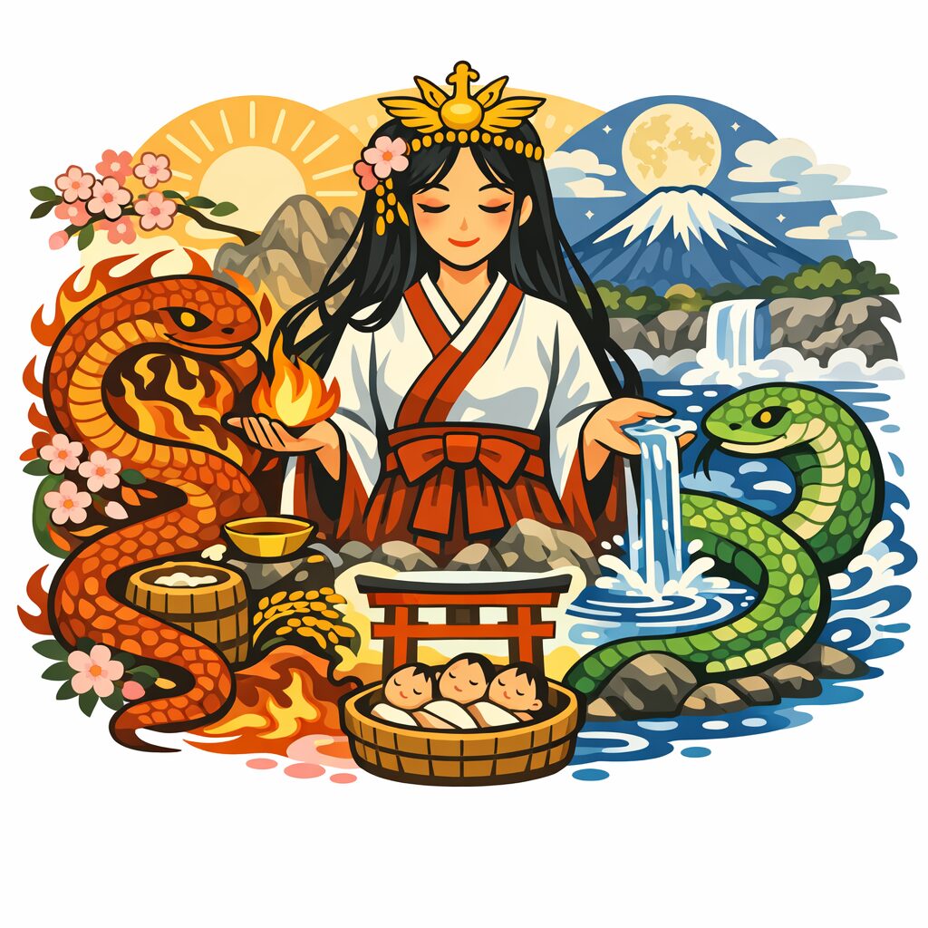 木花咲耶姫と蛇神の結びつきは、記紀に明示されないにもかかわらず、古代の自然観・山岳信仰・火山観を踏まえると、きわめて深い層で連続しています。