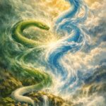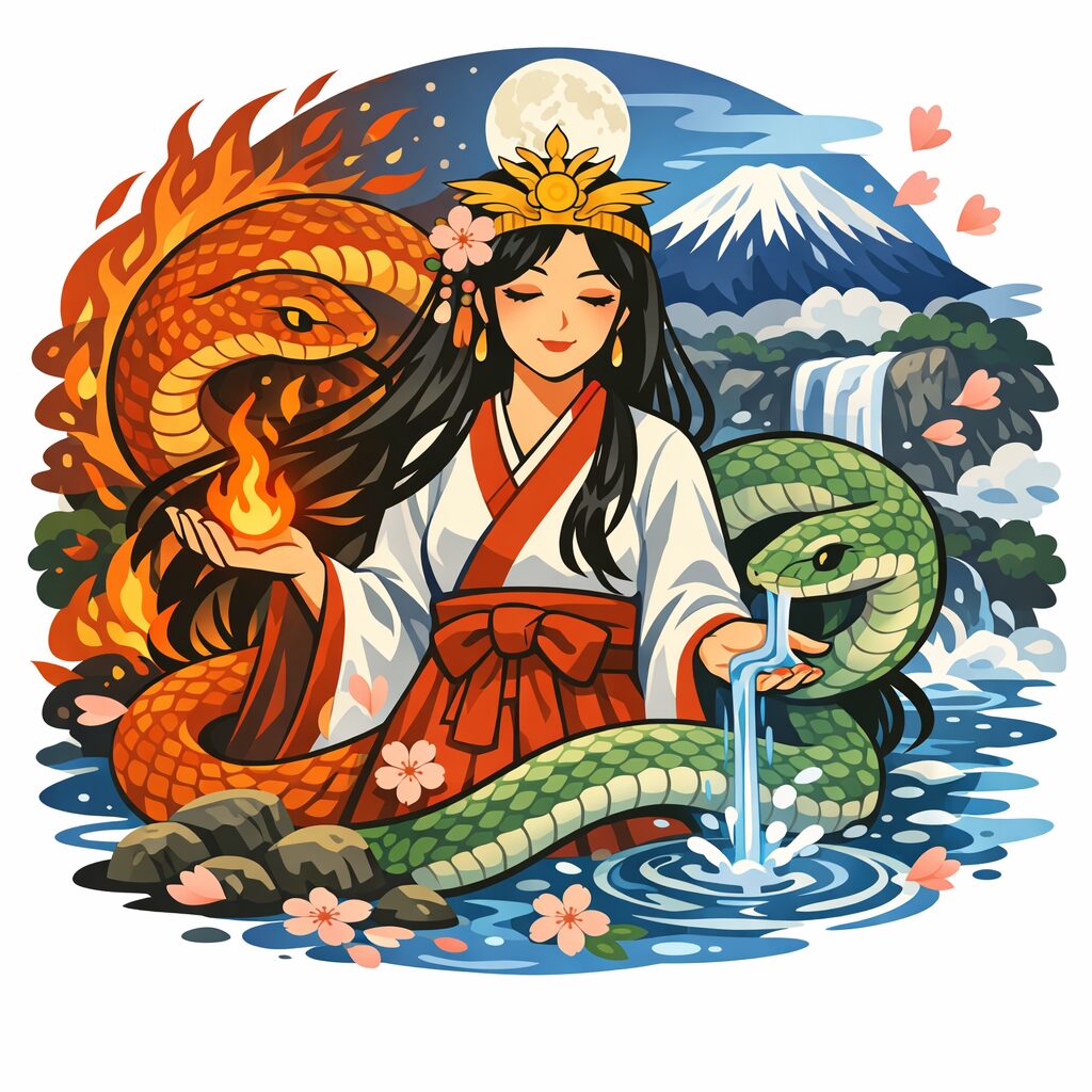 蛇神は古来「火」と「水」という相反する力を同時に宿す存在とされました。地中の火を噴き上げる火山の力と、山中の湧水・水脈を生み出す水霊の働きが一体となって蛇神の本質を形づくります。木花咲耶姫が火中出産を行う神話は、火の浄化と再生を象徴し、同時に富士山の水脈を司る山の女神としての側面も持つため、蛇神の二重性と完全に重なります。