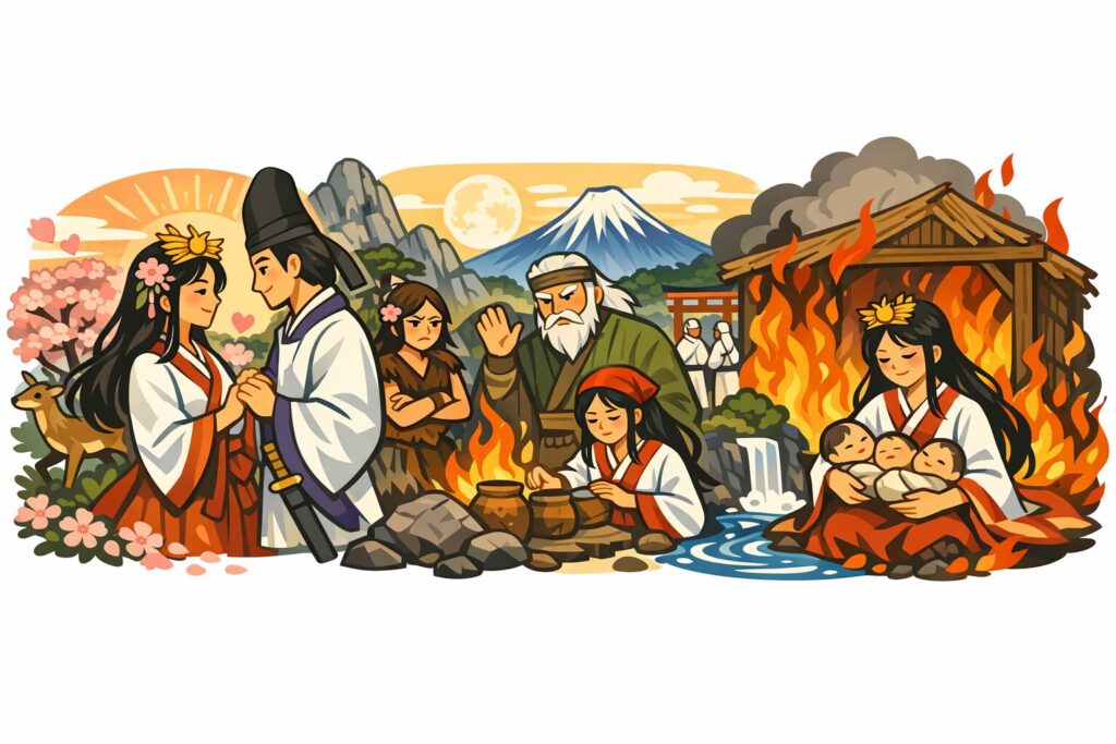 彼女の最も劇的な場面が「火中出産」です。ニニギに「本当に私の子か」と疑われた木花咲耶姫は、自らの潔白を証明するために産屋に火を放ち、燃え盛る炎の中で三柱の神を産み落とします。この行為は、火の浄化と再生の象徴であり、同時に天孫の血統が確かに地上へ根づいたことを示す儀礼的な宣言でもありました。生まれた三柱の神の系譜はやがて神武天皇へとつながり、皇統の起源を形づくることになります。こうして木花咲耶姫は、天と地を結ぶ婚姻の女神であり、人間の有限性を定めた象徴的存在であり、さらに皇統の誕生を火の中で支えた母神として、日本神話の根幹に深く関わる女神として描かれています。